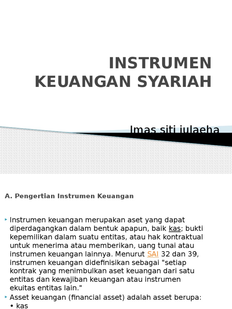 Menurut sai 32 dan 39, instrumen keuangan didefinisikan sebagai setiap kontrak yang menimbulkan aset keuangan dari satu entitas dan kewajiban keuangan atau instrumen. Karna dalam berinvestasi tidak hanya uang saja yang bisa diinvestasikan tapi bisa seperti emas, properti, apertemen, dan lain sebagainya untuk dijadikan modal untuk berinvestasi. Anda bisa memilih instrumen investasi apa yang akan anda pakai guna memberikan pendapatan yang sesuai dengan kebutuhan di masa depan.