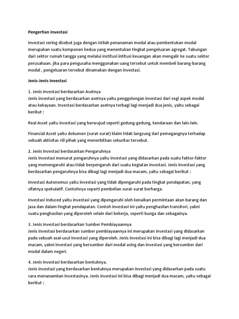 Semoga dapat membantu menambah wawasan. Pengertian investasi menurut para ahli ekonomi. Rumusan masalah dalam makalah ini, kami merumuskan masalah yang dijabarkan dalam pertanyaan sebagai berikut:
