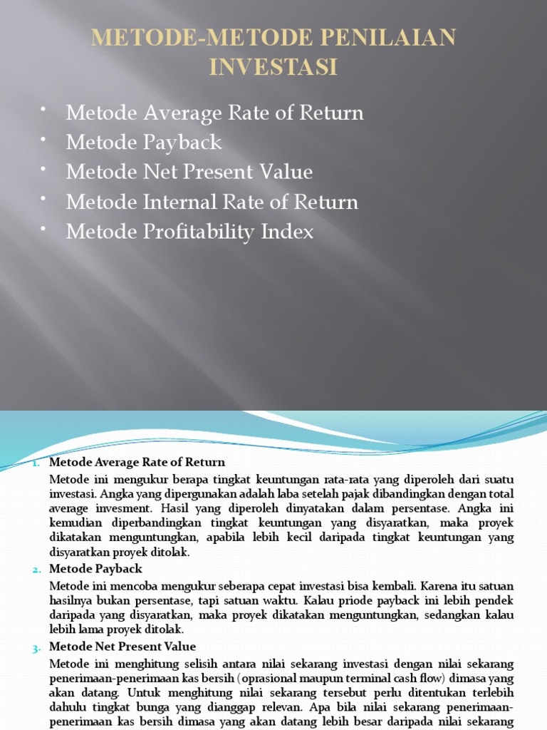 5 metode sederhana penilaian investasi, mana favorit anda? Apabila kita te lah mengumpulkan infor masi. Metode penilaian investasi pada aset riil.